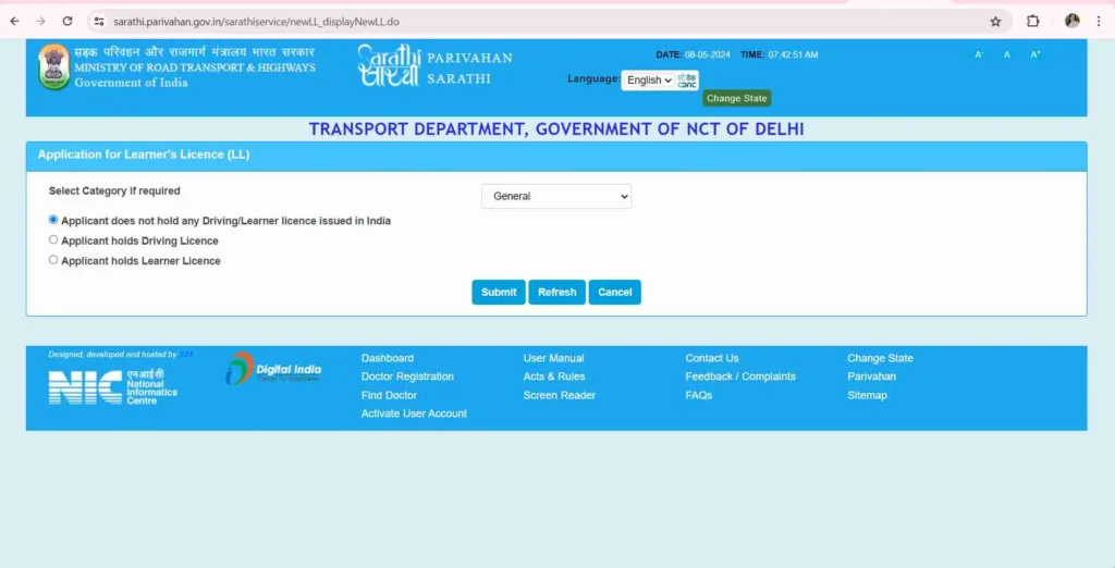 - Visit Parivahan Sewa at: https://sarathi.parivahan.gov.in/