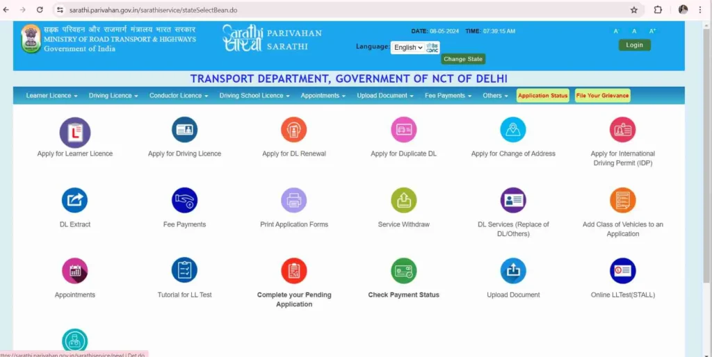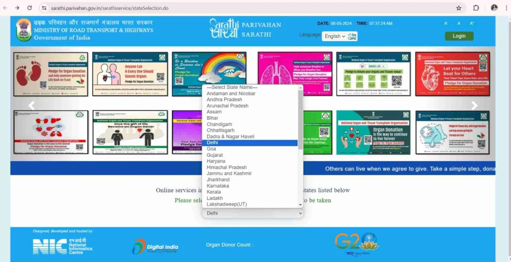 - Step 3: You will be redirected to the Parivahan Sarathi portal (Ministry of Road Transport & Highways). Click on “Select States” and choose “Delhi”.